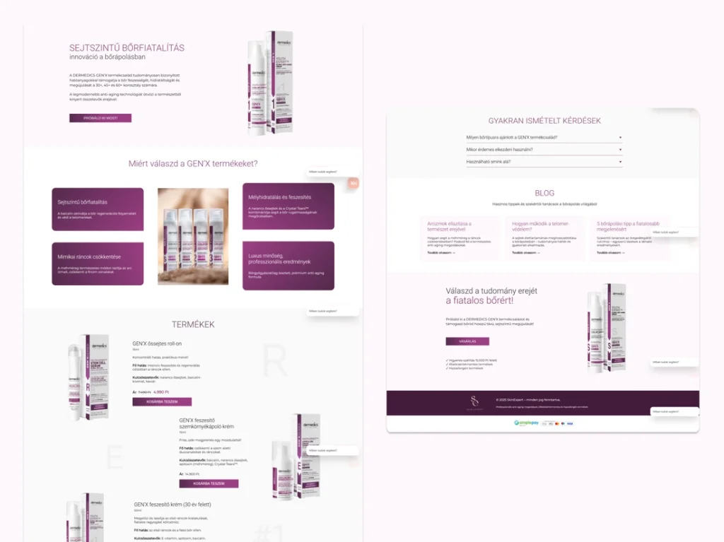A SkinExpert csapata orvoskozmetológiai termékeket forgalmaz, és a marketing kampányaikhoz kértek landoló oldalakat. A DERMEDICS GEN’X termékcsalád részére készült az alábbi landing page:
