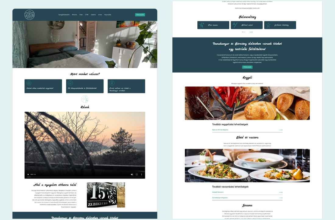 Az oldal dizájnja modern és lendületes. A színpaletta és a struktúra tükrözi a vendégház stílusát és atmoszféráját. A grafikus által tervezett logó és az ikonok játékos elemeket csempésznek a designba, ami felkeltheti a látogatók figyelmét és emlékezetes élményt nyújthat.